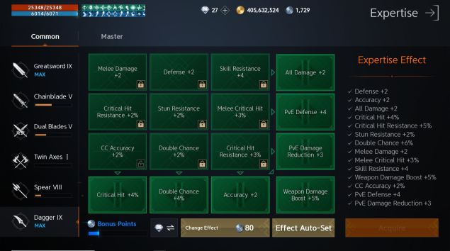 Мастерство на даггера — фулл зелёное, слоты нужно перекручивать, не топовые.