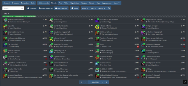 — Большая коллекция, включая редкие дропы с рейдов, маунты с мировых боссов, а также магазинные и ивентовые. (Полный список на скринах).