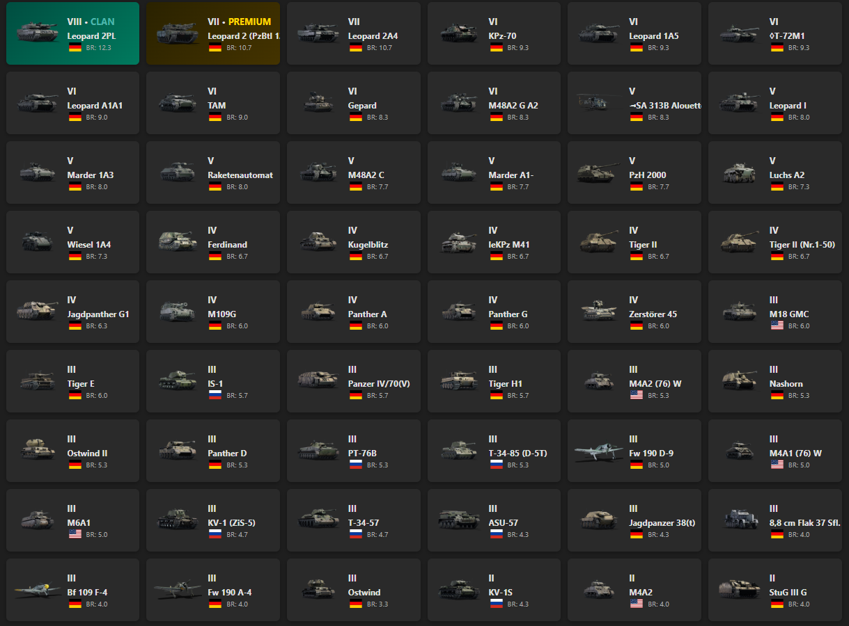 VIII - 1, VII - 2 Leopard 2PL, Leopard 2 (PzBtl 123), Leopard 2A4, KPz-70, Leopard 1A5, T-72M1, Leopard A1A1, TAM