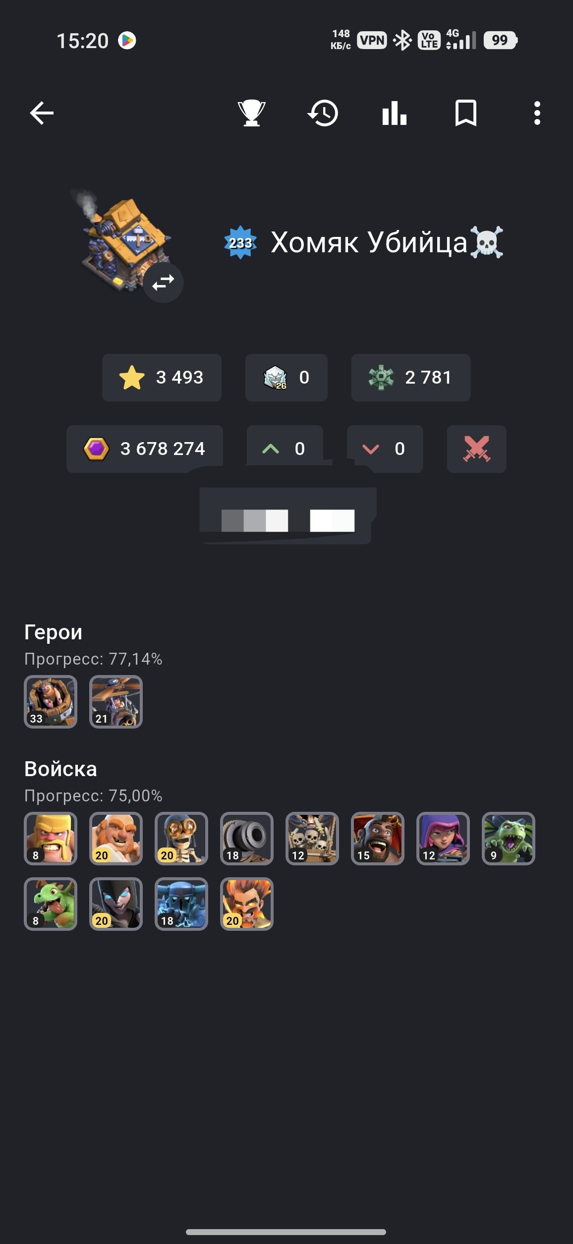 Уровень Ратуши: 17Краткое описание: 🎅🎁17TH(233 Ур.)🎁⭐3493 ЗВËЗД⭐100-100-75-75-50-1📜34 СНАРЯГИ🔮СМЕНА НИКА 1К🎎ЗАБОР 15-16 ЛВЛ🌸🪙