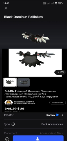 На данном аккаунте есть очень дорогие предметы за коды от роблокс игрушек.Они представлены на фотографиях. Фотографии были взяты с с сайтов eBay и Яндекс Маркет. Так же есть не только эти предметы за роблокс игрушки, тоже предоставлен скриншот бандла. Цены на редкие предметы могут быть разными. Самый дорогой предмет на аккаунте — это Black Dominus Palliolum.