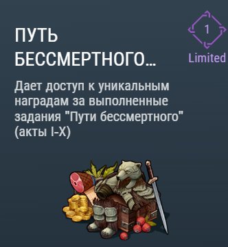 — Дает доступ к уникальным наградам за выполненные задания «Пути бессмертного» (акты I-X)