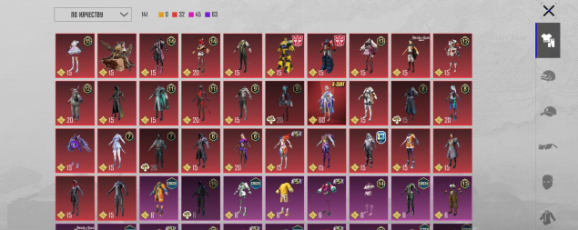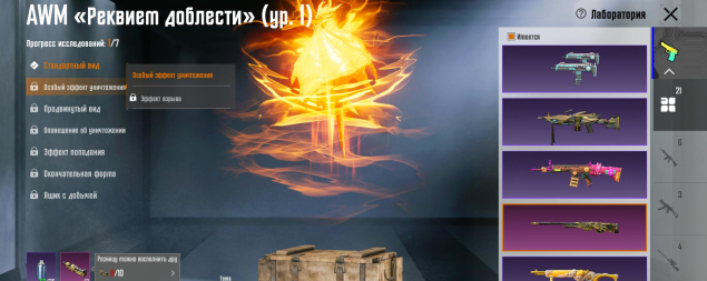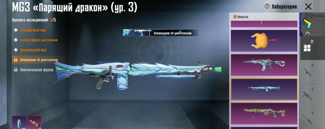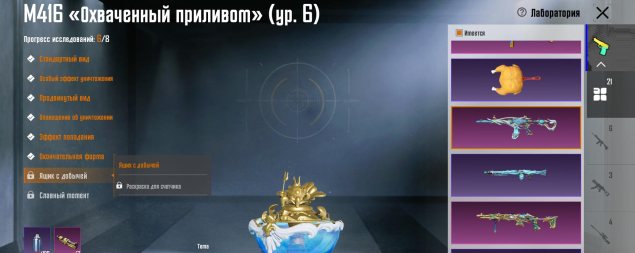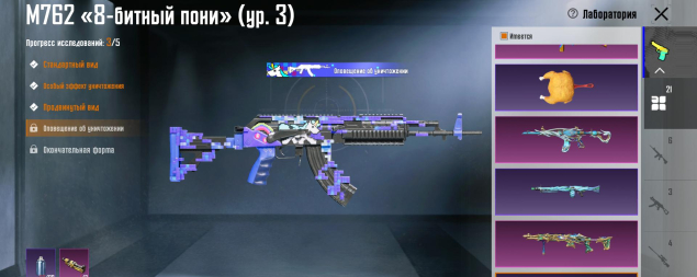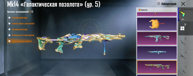 M416 Охваченный приливом 6 лвл, Mk14 Галактическая позолота 5 лвл, Mk47 3 лвл, УЗИ 3 лвл, SLR 3 лвл, Бизон 3 лвл, Томпсон 3 лвл, MG3 Парящий дракон 3 лвл, M762 8-битный пони 3 лвл, S12K Атомный триггер, MG3 Небесная охотница 3 лвл, Сковорода 2 лвл, M16A4 2 лвл, Клинок 2 лвл, СКАР 2 лвл, AWM Реквием и другие, 21 оружие