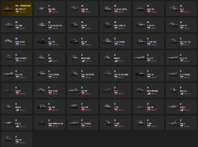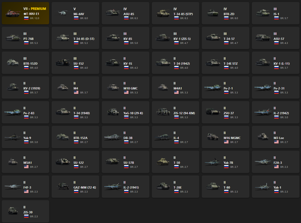 VII - 1, V - 1 ◍Т-80U-Е1, Mi-4AV, ASU-85, T-34-85 (STP), BTR-ZD, IS-1, PT-76B, T-34-85 (D-5T), KV-85, KV-1 (ZiS-5)