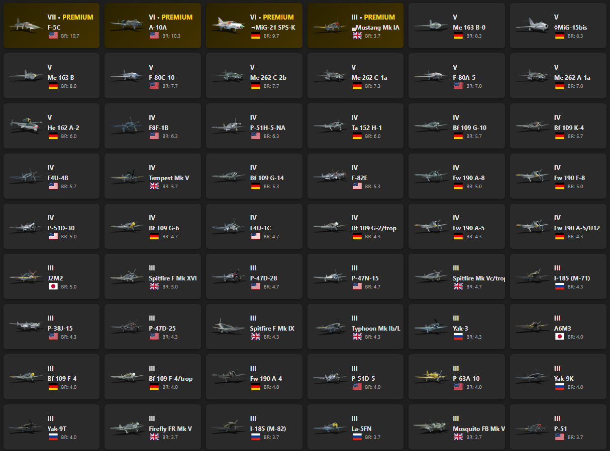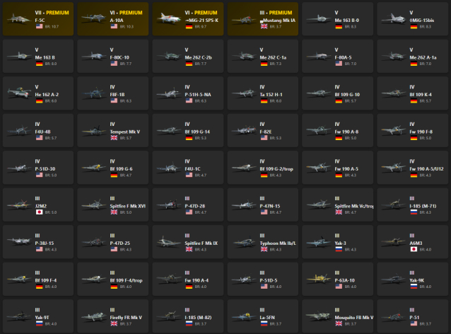 VII - 1, VI - 2 F-5C, A-10A, MiG-21 SPS-K, Mustang Mk IA, Me 163 B-0, ◊MiG-15bis, Me 163 B, F-80C-10, Me 262 C-2b