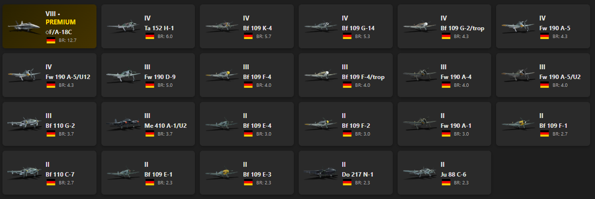 VIII - 1 ◌F/A-18C, Ta 152 H-1, Bf 109 K-4, Bf 109 G-14, Bf 109 G-2/trop, Fw 190 A-5, Fw 190 A-5/U12, Fw 190 D-9