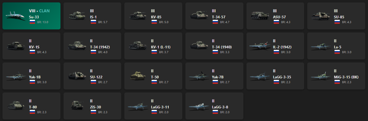 VIII - 1 Su-33, IS-1, KV-85, T-34-57, ASU-57, SU-85, KV-1S, T-34 (1942), KV-1 (L-11), T-34 (1940), IL-2 (1942)