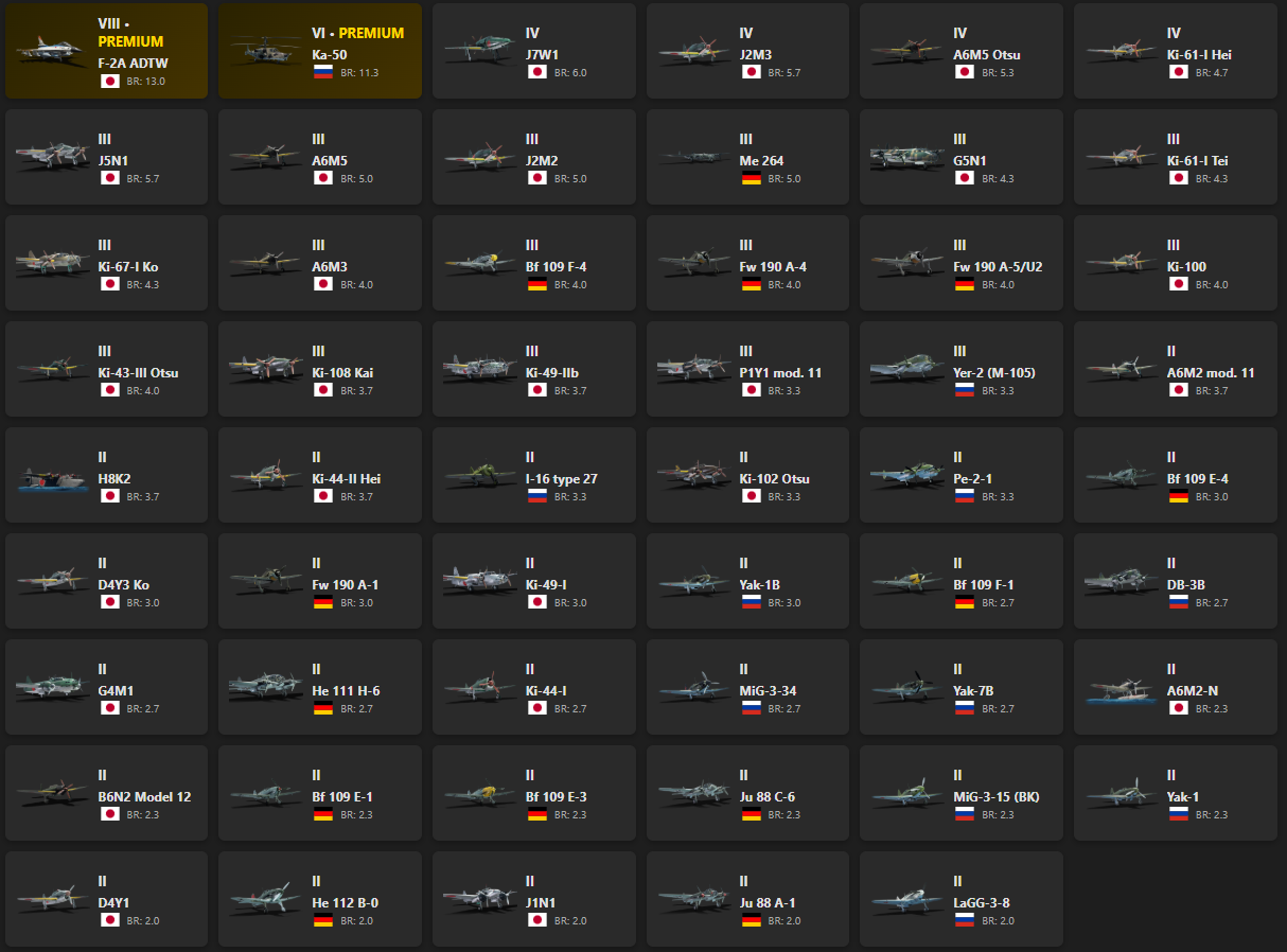 VIII - 1, VI - 1 F-2A ADTW, Ka-50, J7W1, J2M3, A6M5 Otsu, Ki-61-I Hei, J5N1, A6M5, J2M2, Me 264, G5N1, Ki-61-I Tei