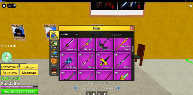 есть все геймпасы и плюс 1 фрукт, перм тирекс, тесто, свет, будда, тигр, мамонт, лед, рокет, музыка. фрукты мифики кдк коса трипл котана