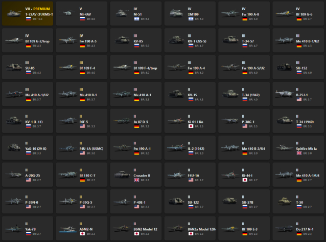 VII - 1, V - 1 T-72AV (TURMS-T), Mi-4AV, M-51, M109, Fw 190 A-8, Bf 109 G-6, Bf 109 G-2/trop, Fw 190 A-5, KV-85