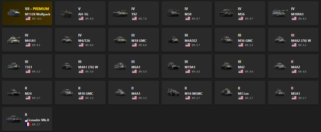 VII - 1, V - 1 M1128 Wolfpack, AH-1G, T92, M50, M56, M109A1, M41A1, M4/T26, M18 GMC, M4A3E2, M36 GMC