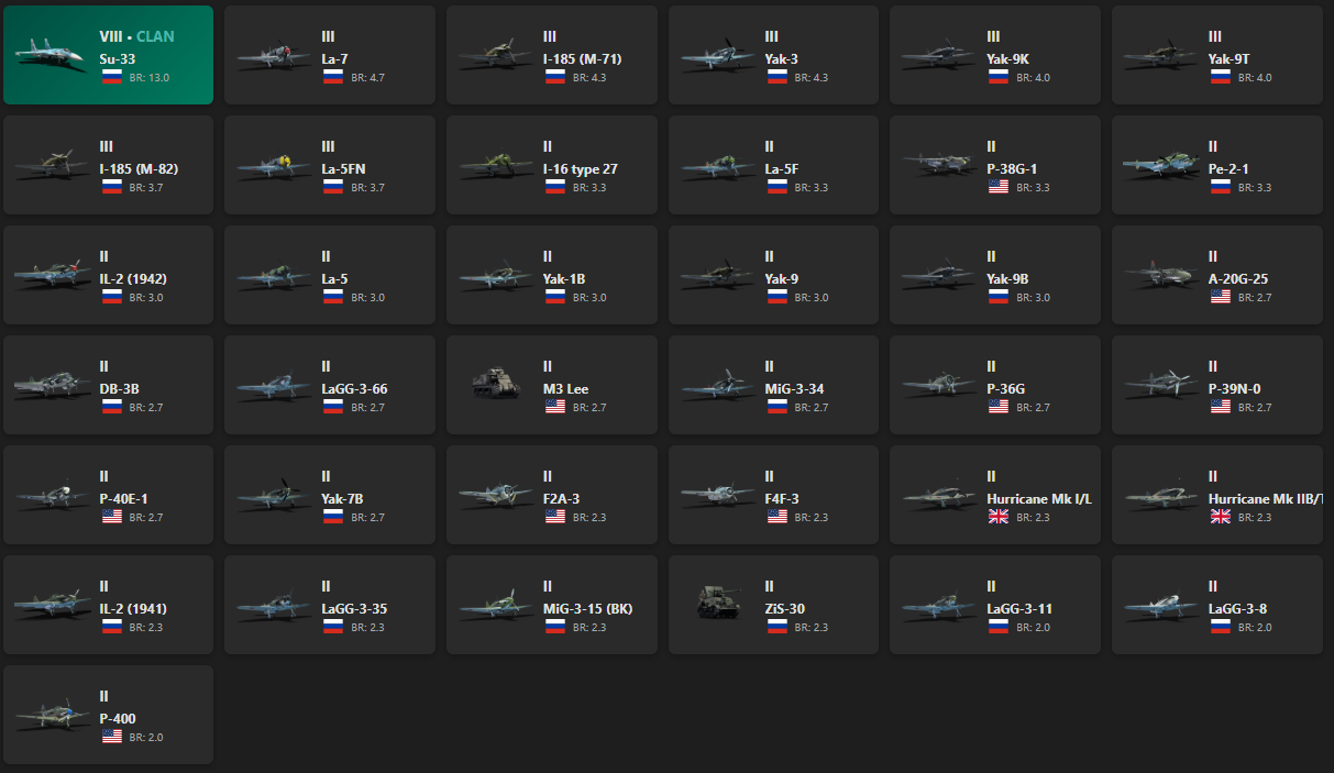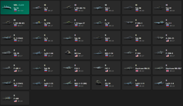 VIII - 1 Su-33, La-7, I-185 (M-71), Yak-3, Yak-9K, Yak-9T, I-185 (M-82), La-5FN, I-16 type 27, La-5F, P-38G-1, Pe-2-1