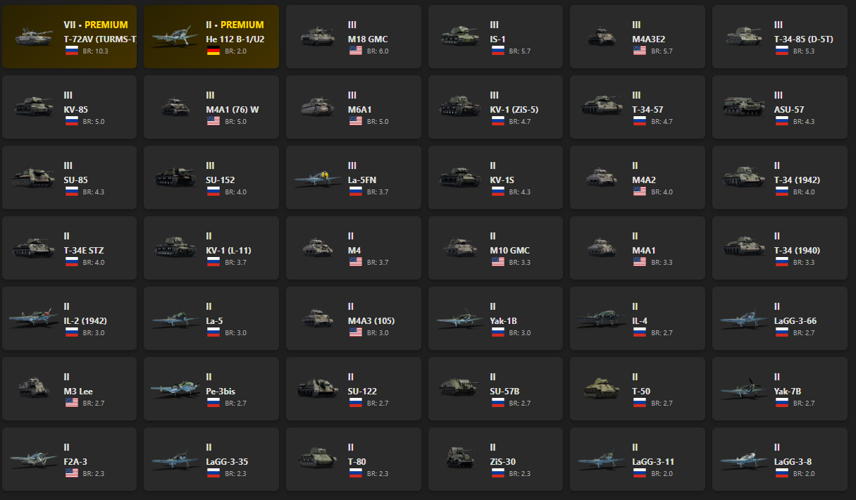 VII - 1 T-72AV (TURMS-T), He 112 B-1/U2, M18 GMC, IS-1, M4A3E2, T-34-85 (D-5T), KV-85, M4A1 (76) W, M6A1