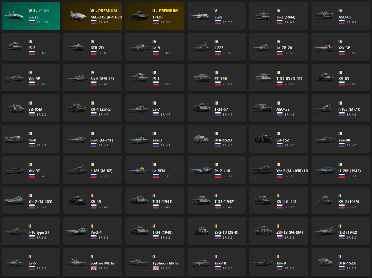 VIII - 1, VI - 1 Su-33, MiG-21S (R-13-300), T-126, Su-9, IS-2 (1944), ASU-85, IS-2, BTR-ZD, La-9, I-225, La-7B-20