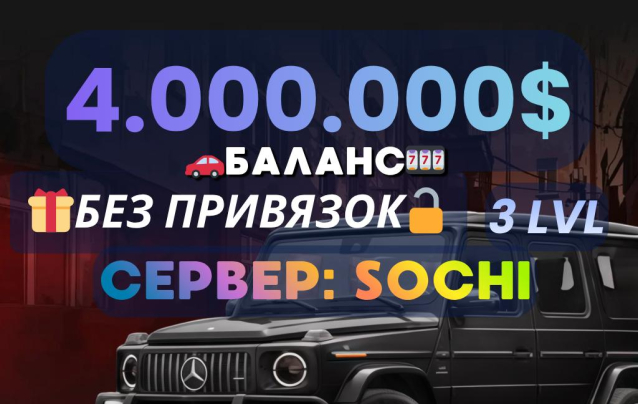 ⚡️ ПОЛНЫЙ ДОСТУП ⚡️ АККАУНТ С 4000000$ БАЛАНС + 3 LVL + VIP ⚡️ SOCHI ⚡️ БЕЗ ПРИВЯЗОК ⚡️ СМОТРИТЕ ОПИСАНИЕ ⚡️Уровень: 3