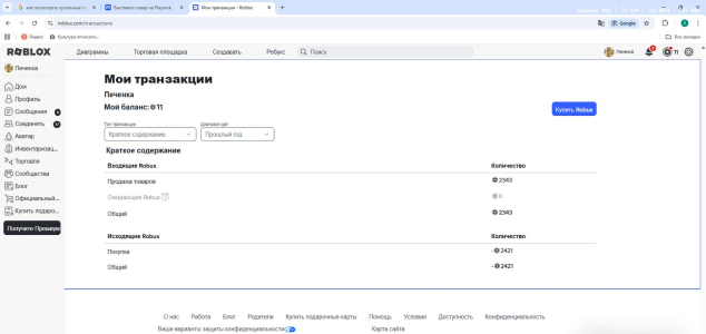 На аккаунт было задоначено за все время 2421 робукс и потрачено тоже 2421.