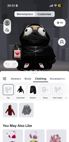 -на покупку одежды было потрачено около 1000 робуксов, различные футболки, штаны, танцы, аксессуары