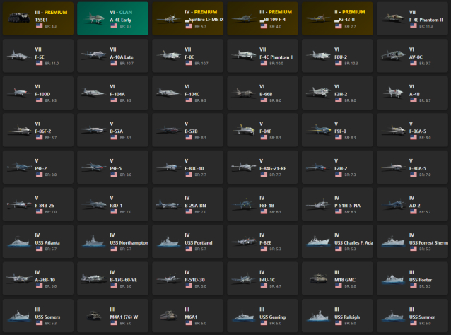 VII - 5, VI - 10 T55E1, A-4E Early, Spitfire LF Mk IXc, Bf 109 F-4, Ki-43-II, F-4E Phantom II, F-5E, A-10A Late, F-8E