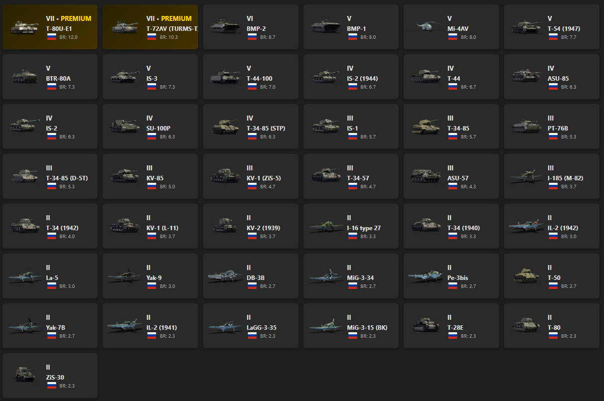 VII - 2, VI - 1 T-80U-E1, T-72AV (TURMS-T), BMP-2, BMP-1, Mi-4AV, T-54 (1947), BTR-80A, IS-3, T-44-100, IS-2 (1944)