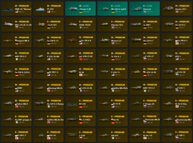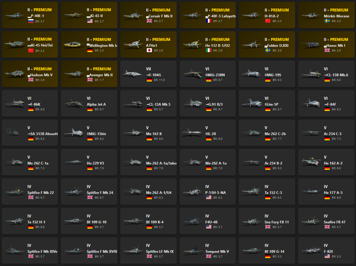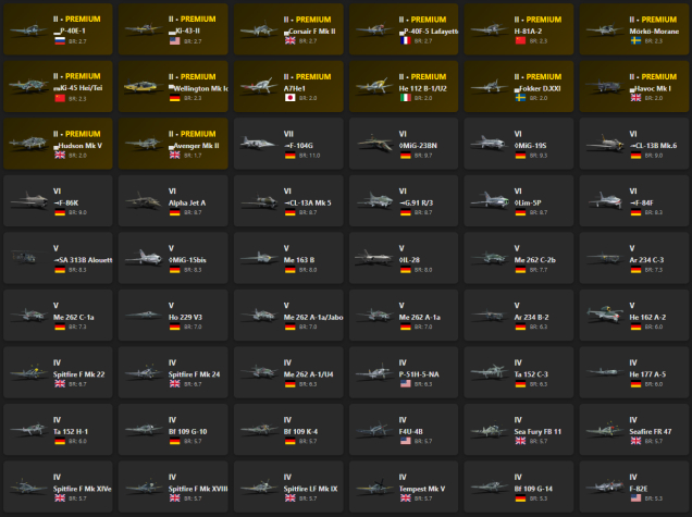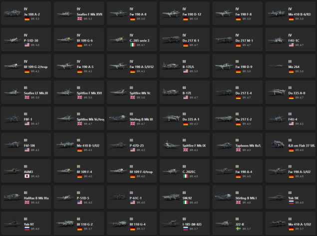 PBM-5A «Mariner», PT-658, ◌Hunter F.58, Me 262 A-1a/U1, Firecrest, Harrier GR.1, MiG-21S (R-13-300), ◄G.91 R/4, SAAB-105OE, Attacker FB.2, Ju 288 C, Do 335 B-2, ▀Tempest Mk V, Fw 190 D-13, ▃Fw 190 A-8, Wyvern S.4, He 219 A-7, ▅Fw 190 A-5, ◐Bf 109 G-2, P-51D-20-NA, ␗F-47N-25-RE, Ta 154 A-1, ▂P-47D-27, BTD-1, Fw 190 A-5/U14, ▃Bf 109 F-4, Ki-96, P-61A-11, ▀P-47D-16-RE, ▂B-25J-30, ▃A6M2, ▄Mustang Mk IA, ▄P-47D-22-RE, ▄Spitfire Mk Vb/trop, ◐Bf 110 G-4, ▂P-63A-5, ▄Hellcat Mk II, Hs 129 B-2 (Romania), BV 238, ▃Ki-61-Ib, I-16 type 28, Ki-44-II Otsu, Re.2001 gruppo 22, Spitfire Mk.IIa Venture I, ▀IL-2 (1942), ▀Yak-1B, ▂Hurricane Mk IIB, ▄Boomerang Mk I, ▅Bf 109 E-7, ▅F4U-1A, I-153P, IAR-81C, Ki-44-I 34, ▂P-39K-1, ▂P-40E-1, ▃Ki-43-II, ▄Corsair F Mk II, ▄P-40F-5 Lafayette, H-81A-2, Mörkö-Morane, ␗Ki-45 Hei/Tei, ▀Wellington Mk Ic, A7He1, He 112 B-1/U2, ▄Fokker D.XXI, ▄Havoc Mk I, ▄Hudson Mk V, ▄Avenger Mk II, ◄F-104G, ◊MiG-23BN, ◊MiG-19S, ◄CL-13B Mk.6, ◄F-86K, Alpha Jet A, ◄CL-13A Mk 5, ◄G.91 R/3, ◊Lim-5P, ◄F-84F, ◄SA 313B Alouette II, ◊MiG-15bis, Me 163 B, ◊IL-28, Me 262 C-2b, Ar 234 C-3, Me 262 C-1a, Ho 229 V3, Me 262 A-1a/Jabo, Me 262 A-1a, Ar 234 B-2, He 162 A-2, Spitfire F Mk 22, Spitfire F Mk 24, Me 262 A-1/U4, P-51H-5-NA, Ta 152 C-3, He 177 A-5, Ta 152 H-1, Bf 109 G-10, Bf 109 K-4, F4U-4B, Sea Fury FB 11, Seafire FR 47, Spitfire F Mk XIVe, Spitfire F Mk XVIIIe, Spitfire LF Mk IX, Tempest Mk V, Bf 109 G-14, F-82E, Ju 188 A-2, Seafire F Mk XVII, Fw 190 A-8, Fw 190 D-12, Fw 190 F-8, Me 410 B-6/R3, P-51D-30, Bf 109 G-6, C. 205 serie 3, Do 217 K-1, Do 217 M-1, F4U-1C, Bf 109 G-2/trop, Fw 190 A-5, Fw 190 A-5/U12, B-17E/L, Fw 190 D-9, Me 264, Seafire LF Mk.III, Spitfire F Mk XVI, Spitfire Mk Vc, B-17E, Do 217 E-4, Do 335 A-0, F8F-1, Spitfire Mk Vc/trop, Stirling B Mk III, Do 335 A-1, Do 217 E-2, F4U-4, F6F-5N, Me 410 B-1/U2, P-47D-25, Spitfire F Mk IX, Typhoon Mk Ib/L, 8,8 cm Flak 37 Sfl., A6M3, Bf 109 F-4, Bf 109 F-4/trop, C. 202EC, Fw 190 A-4, Fw 190 A-5/U2, Halifax B Mk IIIa, P-51D-5, P-61C-1, SM.92, Stirling B Mk I, Yak-9K, Yak-9T, Bf 110 G-2, Bf 110 G-4, I-185 (M-82), J22-B, Me 410 A-1/U2, Me 410 B-1, P-51, PBJ-1H, Wirbelwind, ▄SB2C-5, Firefly F Mk I, IL-2M (1943), M.B.157, Me 410 A-1, P-63A-5, Re.2001 CN, StuG III G, A6M2, A6M2 mod. 11, B-25J-1, B-25J-20, Beaufighter Mk 21, C. 205 serie 1, Firebrand TF Mk IV, Ki-44-II Hei, Ki-61-I Otsu, SM.91, Spitfire Mk IIb, Spitfire Mk Vb/trop, Tempest Mk V (Vickers P), F6F-5, I-16 type 27, Ju 87 D-5, Ki-102 Otsu, Ki-61-I Ko, La-5F, M10 GMC, M4A1, P-38G-1, Pz.III M, Pz.IV F2, Pz.IV G, StuG III F, T-34 (1940), ▄F6F-5, Beaufighter Mk VIc, Beaufighter Mk X, Bf 109 E-4, Bf 110 F-2, Bf 109 F-2, C. 202, D.520, F4U-1D, Fw 190 A-1, He 111 H-16, IL-2 (1942), J22-A, Ju 88 A-4, LeO 451 early, Me 410 B-2/U4, N.C.223.3, Pz.III L, Re.2001 CB, Re.2001 serie 1, SB2C-1C, Sea Hurricane Mk IC, Spitfire Mk Ia, Spitfire Mk IIa, Typhoon Mk Ia, Wellington Mk III, Yak-1B, Yak-9, ▄Ju 88 A-4, A-20G-25, A-36, B18A, Bf 109 F-1, Bf 110 C-7, Do 217 N-2, F4U-1A, G4M1, He 111 H-6, IL-2-37, Ki-44-I, LaGG-3-66, M16 MGMC, M3 Lee, Me 410 A-1/U4, MiG-3-34, P-39N-0, P-40E-1, Pe-3bis, Pz.III J1, T-50, V.G.33C-1, Wellington Mk Ic/L, Yak-7B, Z.1007 bis serie 3, ▄A-35B, ▄B-239, A6M2-N, B6N2 Model 12, B6N2a Model 12Ko, Bf 109 E-1, Bf 109 E-3, C. 200 serie 3, Do 217 N-1, F2A-3, F4F-3, GAZ-MM (72-K), Hs 129 B-2, Hurricane Mk I/L, Hurricane Mk IIB/Trop, IL-2 (1941), Ju 88 C-6, LaGG-3-35, M.S.410, N1K1, Potez 630, Potez 631, Re.2002 Early, S.M.79 AS, Wellington Mk Ic, Yak-1, ZiS-30, ▀S.M.79 AS, ▄Hurricane Mk I/L, Fw 200 C-1, He 112 B-0, Hs 129 B-3, Hurricane Mk IV, J1N1, J20, Ju 88 A-1, Ju 87 D-3, LaGG-3-11, LaGG-3-8, P-400, Sea Hurricane Mk IB, ▀S.M.79 serie 8, ▄Ju 87 D-3, S-38b, ▀S.M.79 serie 1