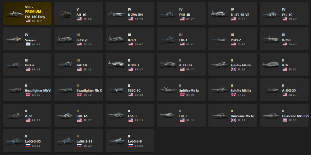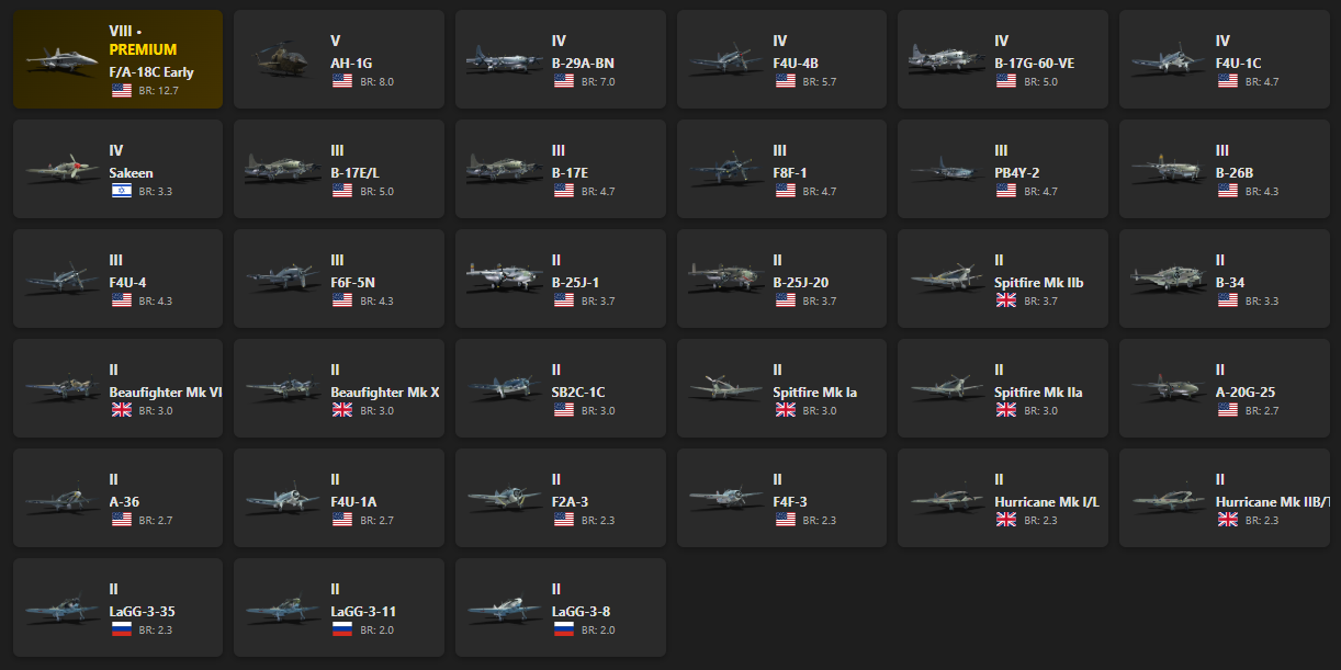 VIII - 1, V - 1 F/A-18C Early, AH-1G, B-29A-BN, F4U-4B, B-17G-60-VE, F4U-1C, Sakeen, B-17E/L, B-17E, F8F-1