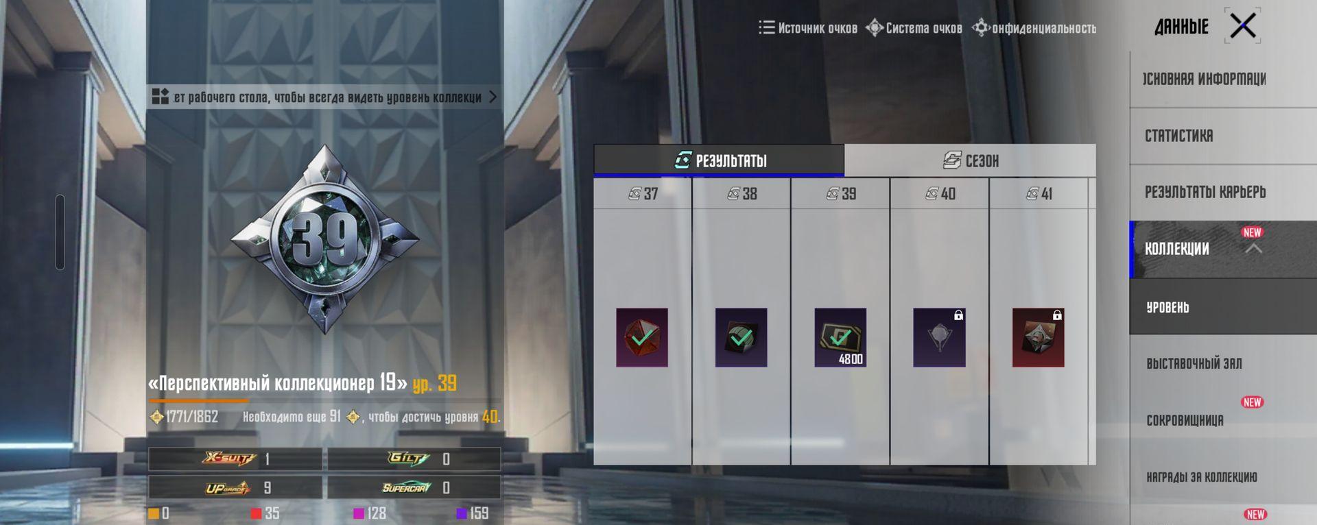 * Коллекция: Уровень «Перспективный коллекционер 39». Много редких эмоций, скинов на транспорт и компаньон-снеговик.