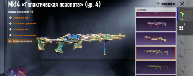 * Оружие: Прокачиваемая Mk14 «Галактическая позолота» (4 ур.) с килл-чатом. Всего 9 скинов с возможностью улучшения.