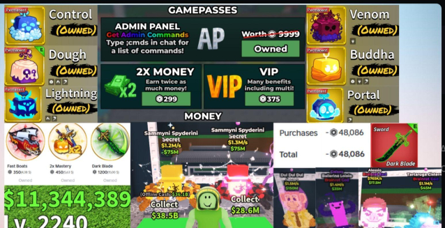 Нереально крутой акк на аккаунте: Админ панель x2 заработок в блока фрукт тоже дофига всего нереального ну и в большинстве режимах тоже крутая прокачка покупайте.