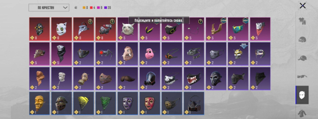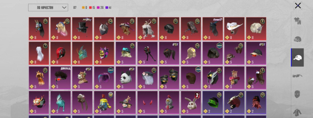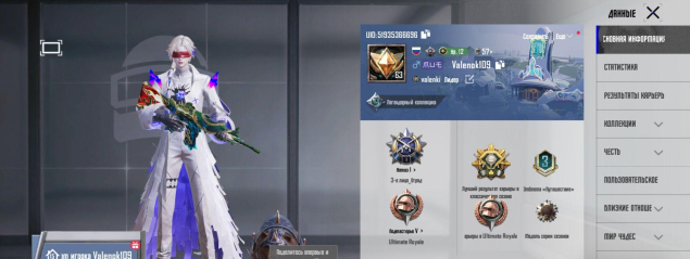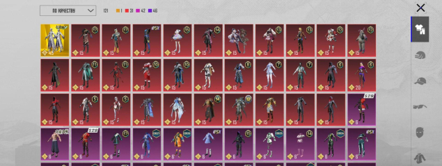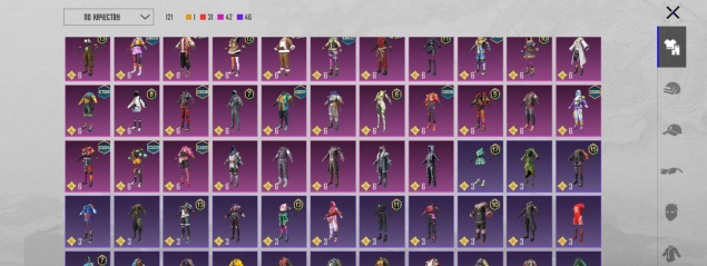 1 золотой костюм, 51 мифик, 250+ лег, 260+ эпиков, множество мифик эмоций, 16 прокачиваемых оружий, м416 вкаченная до эффекта попаданий