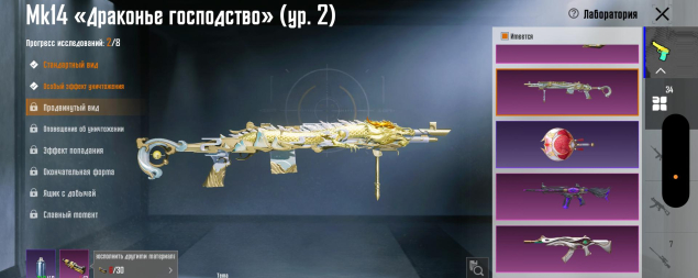 M416 Рев ящера 7 лвл, P90 Золотой коготь 5 лвл, M416 Божество ниндзя 4 лвл, M416 Ледник 3 лвл, UMP45 Восемь бит 3 лвл, Mk14 Галактическая позолота 3 лвл, AKM Решающий день 3 лвл, Томагавк 3 лвл, Mk14 Драконье господство 2 лвл, 34 оружия всего!!!