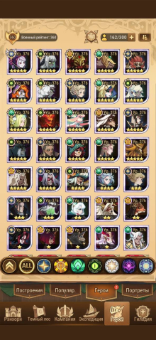 22 героя с 5 звездами, 2 героя с 4 звездами, 3 героя с 3 звездами, 3 героя с 2 звездами, 4 героя с 1 звездой, 1 возвышен