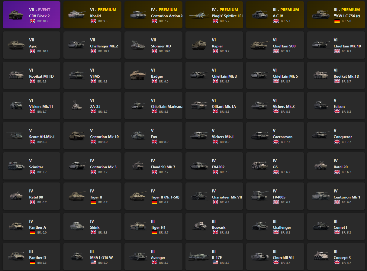 VII - 4, VI - 15 CRV Block 2, Khalid, Centurion AX, Challenger Mk.2, Stormer AD, Rapier, Chieftain 900, Plagis' Spitfire LF Mk IXc