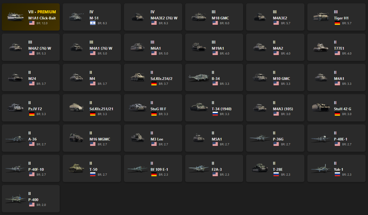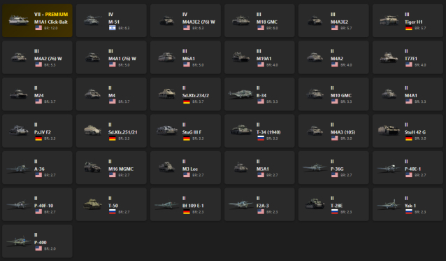 VII - 1 M1A1 Click-Bait, M-51, M4A3E2 (76) W, M18 GMC, M4A3E2, Tiger H1, M4A2 (76) W, M4A1 (76) W, M6A1, M19A1