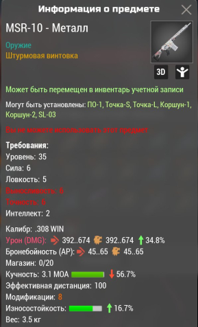 Сервер: USA-3Краткое описание: MSR 10 М8 34,8% К урону (392-674), -56,7% Кучность (3,1МОА), +16,7% Износ (Любой сервер)