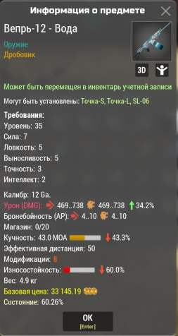 Сервер: USA-3Краткое описание: Вепрь12 М8 Вода 34,2% К Урону (469-738),-43,3% Кучность (43МОА), -60 Износ (Любой сервер)