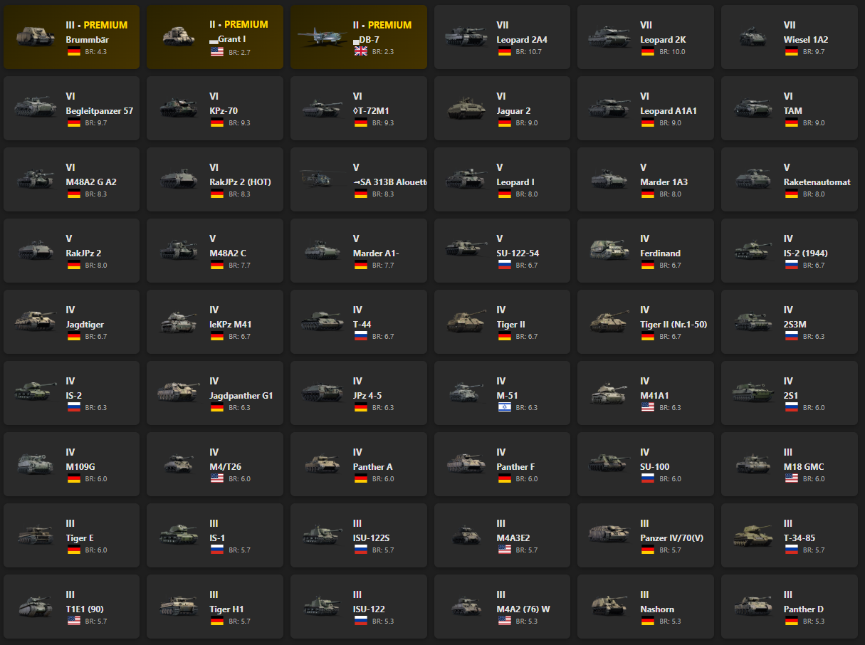 VII - 3, VI - 8 Brummbär, Leopard 2A4, Leopard 2K, Wiesel 1A2, Begleitpanzer 57, KPz-70, ◊T-72M1, Jaguar 2, Leopard A1A1