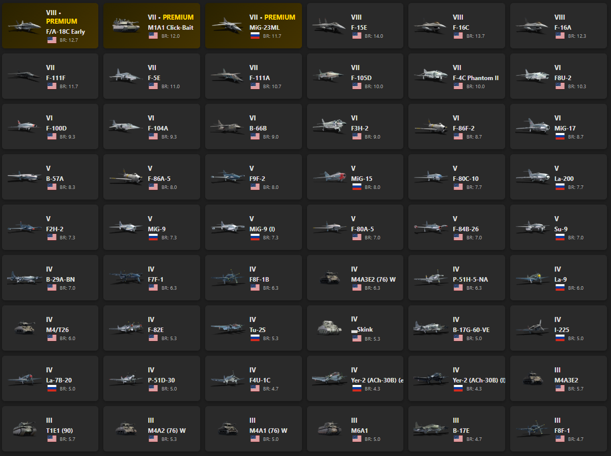 VIII - 4, VII - 7 F/A-18C Early, M1A1 Click-Bait, MiG-23ML, F-15E, F-16C, F-16A, F-111F, F-5E, F-111A, F-105D, F-4C Phantom II