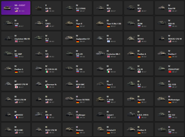 Уровень: 89. VII - 1, V - 1 CCVL, AH-1G, IS-2 (1944), M26, M56, Ratel 90, T-44, T26E5, Tiger II, Tiger II (Nr.1-50), 2S3M