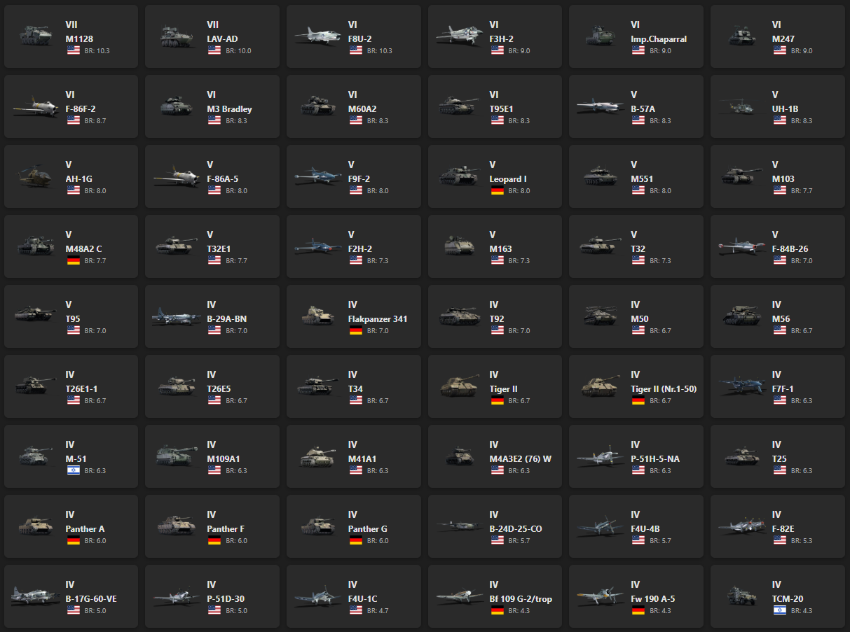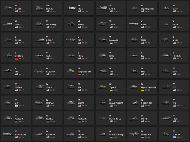 VII - 2, VI - 8, V - 15 M1128, LAV-AD, F8U-2, F3H-2, Imp.Chaparral, M247, F-86F-2, M3 Bradley, M60A2, T95E1, B-57A