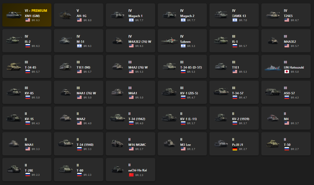 VI - 1, V - 1 XM1 (GM), AH-1G, Magach 1, Magach 2, AMX-13, T26E5, IS-2, M-51, M4A3E2 (76) W, Sakeen, IS-1