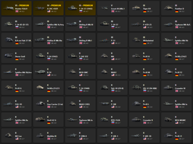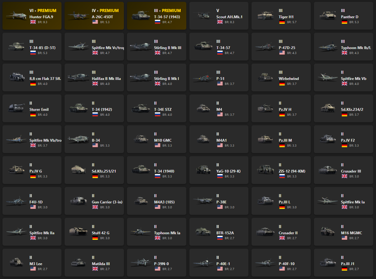 VI - 1, V - 1 Hunter FGA.9, A-26C-45DT, T-34-57 (1943), Scout AH.Mk.1, Panther D, T-34-85 (D-5T), Spitfire Mk Vc/trop