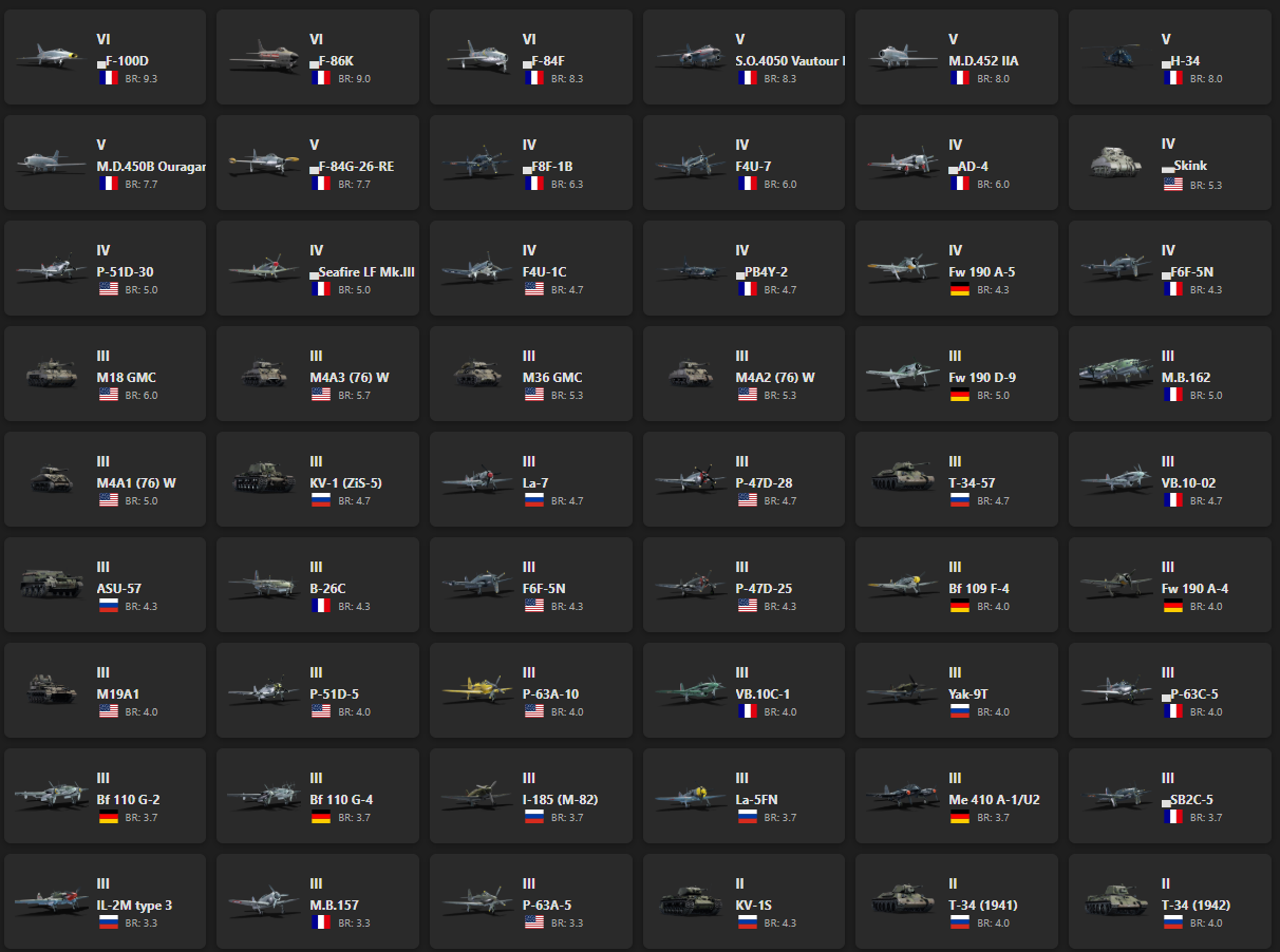 VI - 3, V - 5 ▄F-100D, ▄F-86K, ▄F-84F, S.O.4050 Vautour IIN (Late), M.D.452 IIA, ▄H-34, M.D.450B Ouragan, ▄F-84G-26-RE