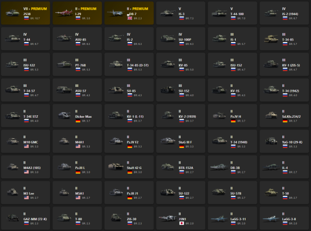 VII - 1, V - 2 2S38, I-29, DB-7, IS-3, T-44-100, IS-2 (1944), T-44, ASU-85, IS-2, SU-100P, IS-1, T-34-85, ISU-122, PT-76B