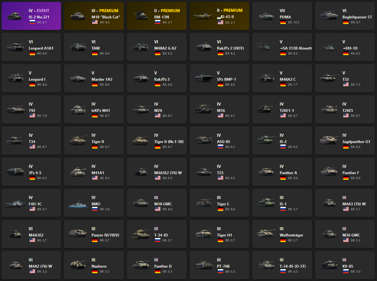 VII - 1, VI - 5 IS-2 No.321, M18 "Black Cat", BM-13N, Ki-43-II, PUMA, Begleitpanzer 57, Leopard A1A1, TAM, M48A2 G A2