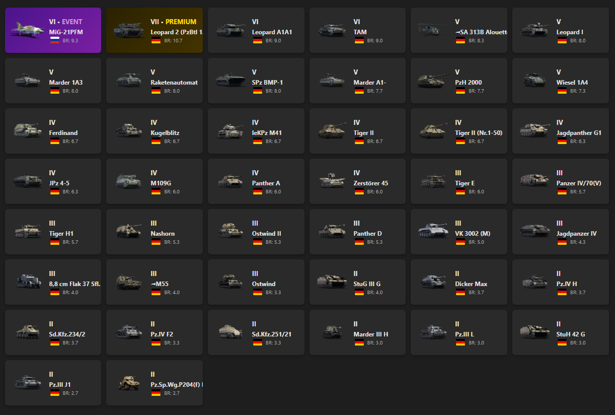 VII - 1, VI - 3, V - 8 MiG-21PFM, Leopard 2 (PzBtl 123), Leopard A1A1, TAM, SA 313B Alouette II, Leopard I, Marder 1A3
