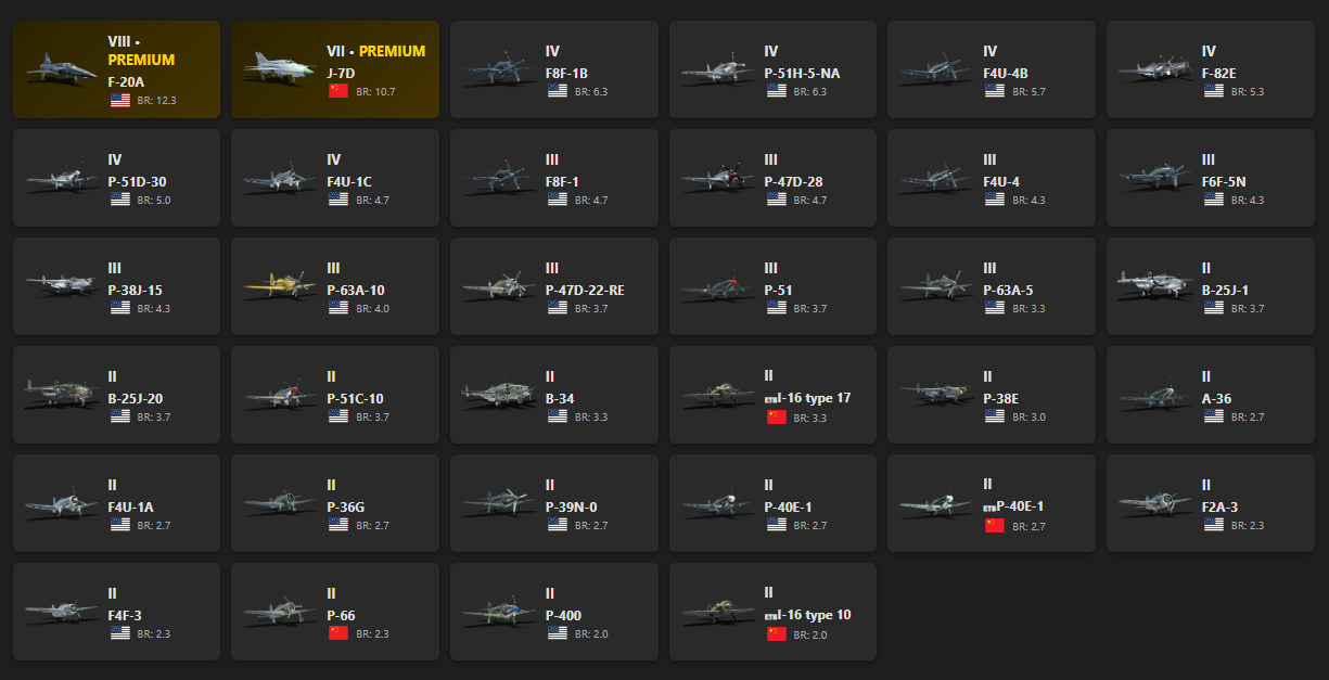 VIII - 1, VII - 1 F-20A, J-7D, F8F-1B, P-51H-5-NA, F4U-4B, F-82E, P-51D-30, F4U-1C, F8F-1, P-47D-28, F4U-4, F6F-5N