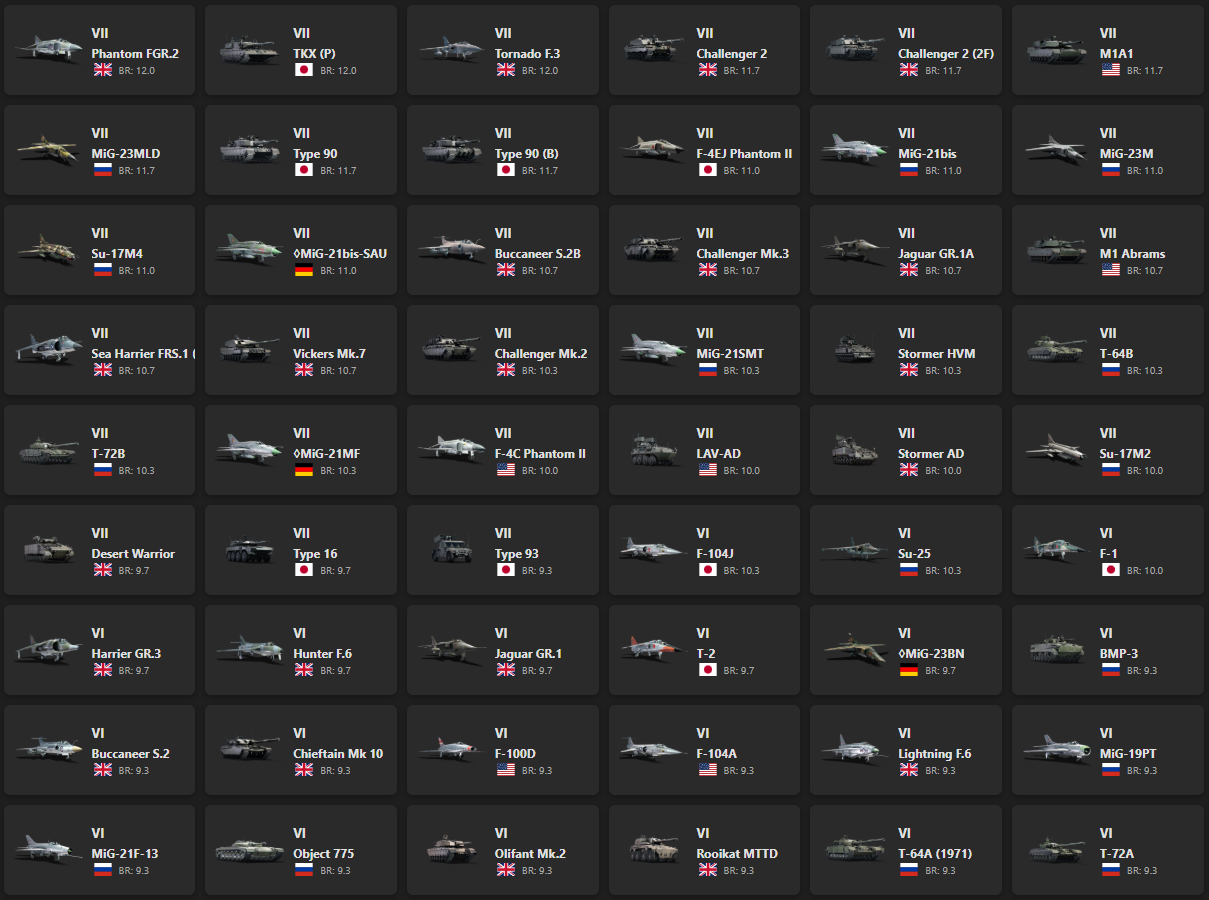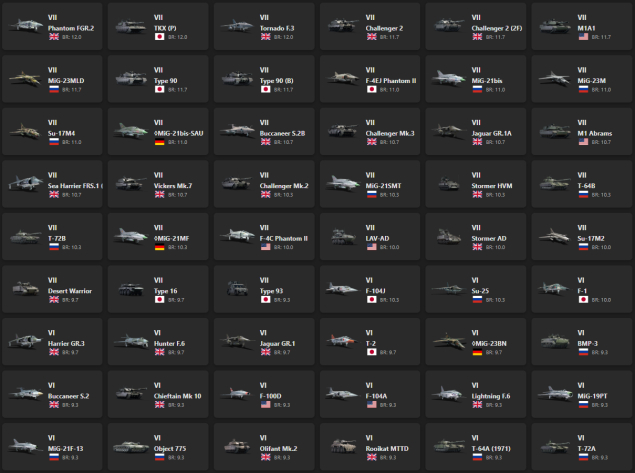 IX - 2, VIII - 7 Su-30SM, Typhoon FGR.4, Su-27SM, ▄JAS39C, MiG-29 (9-13), Su-27, Tornado F.3 Late, F-16AJ, TKX (P), Tornado F.3