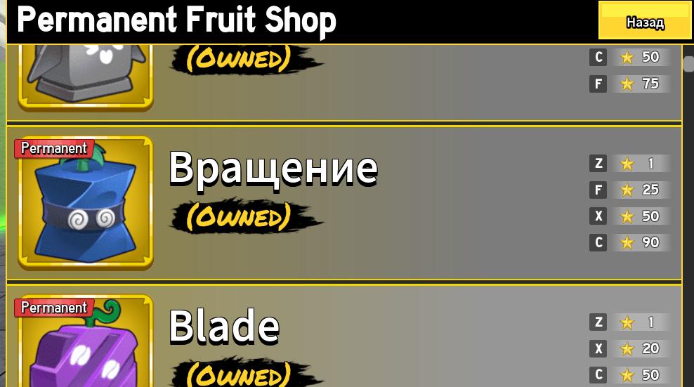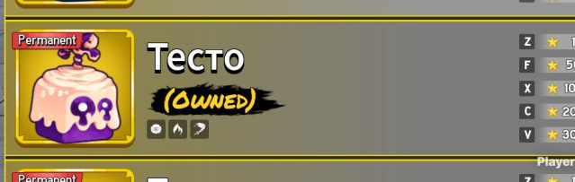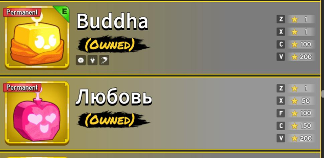 Пермы (постоянные фрукты): Rocket, Spin, Bird: Falcon, Ice, Buddha, Love, Dough.