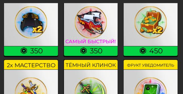 Донат: 5 геймпасов (x2 Money, x2 Mastery, x2 Boss Drops, Fast Boats, Dark Blade).