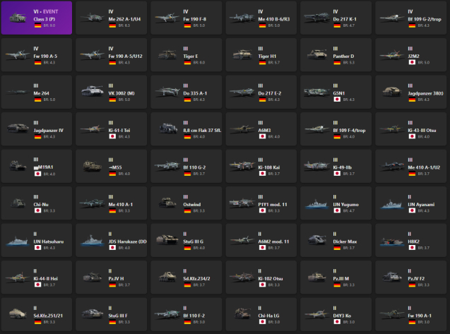 VI - 1 Class 3 (P), Me 262 A-1/U4, Fw 190 F-8, Me 410 B-6/R3, Do 217 K-1, Bf 109 G-2/trop, Fw 190 A-5, Fw 190 A-5/U12